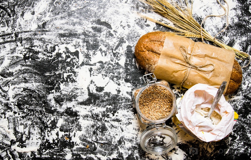 Свежий хлеб чиабатт с мешком муки и колосья пшеницы