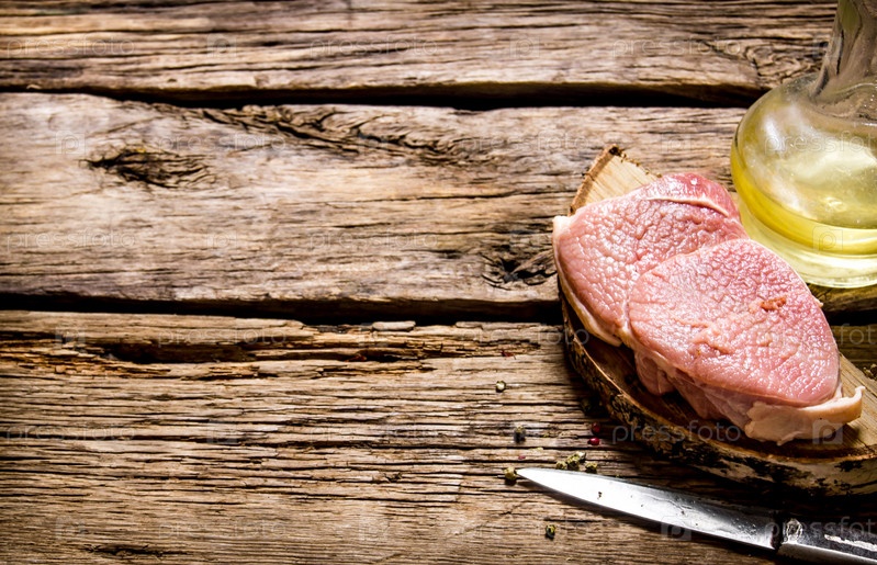 Свежее сырое мясо с ножом и маслом на деревянной подставке