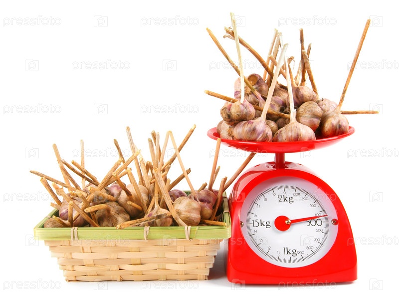 Чеснок на весах и в корзине