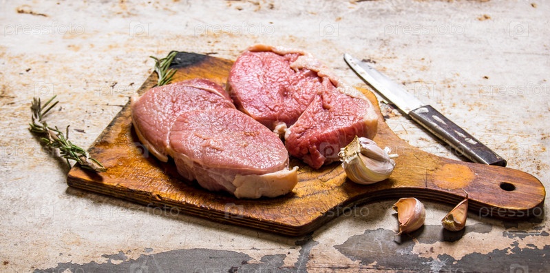 Стейк из свежего сырого мяса со специями на деревянной доске