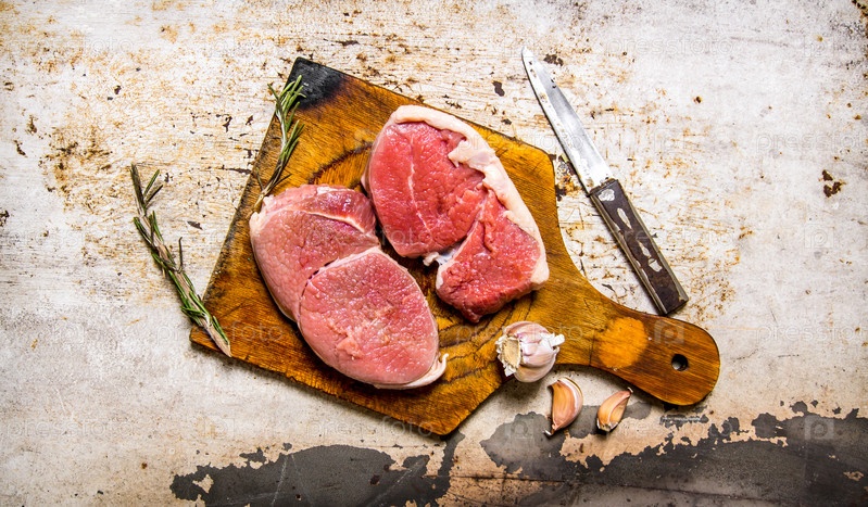 Стейк из свежего сырого мяса со специями на деревянной доске
