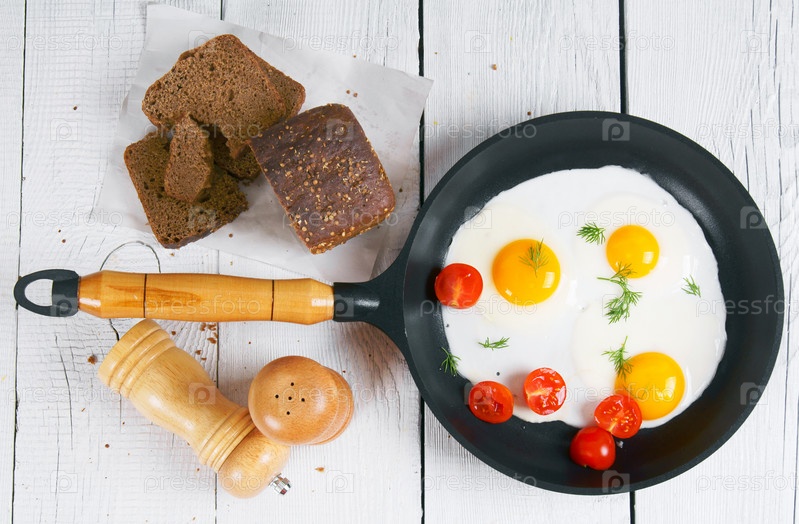 Жареные яйца, укроп и свежие помидоры в сковороде