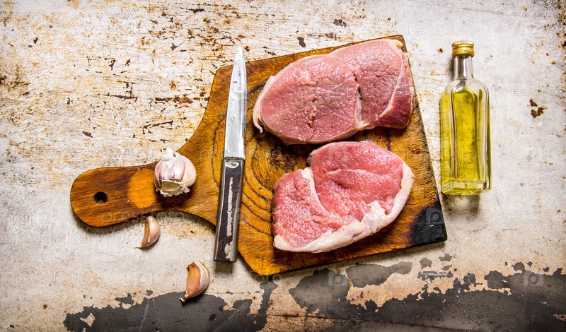 Сырое свежее мясо с чесноком и маслом на деревянной доске