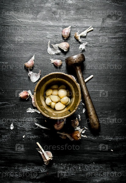Свежий чеснок и ступка с пестиком
