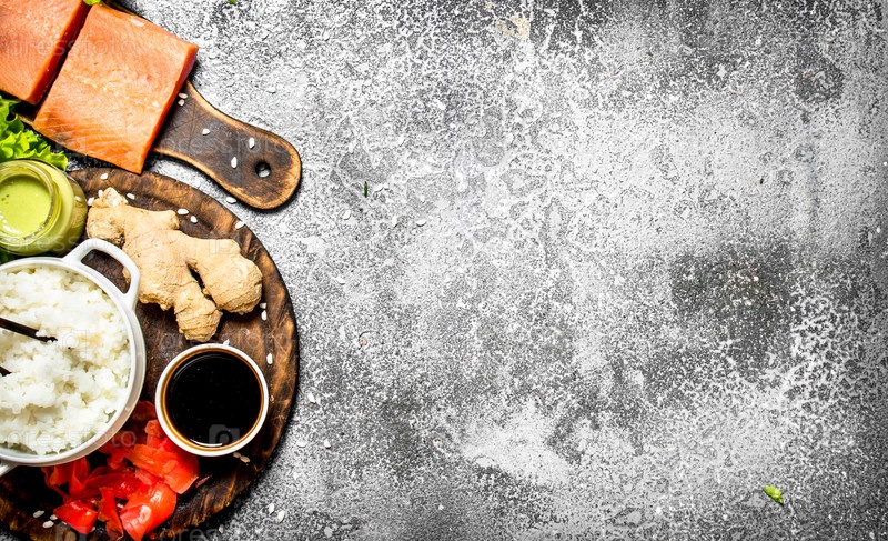 Азиатская еда. Рис с кусочком лосося и соевым соусом на деревенском фоне