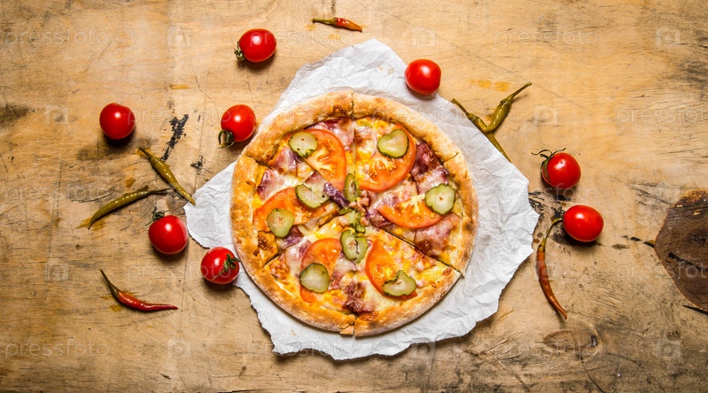Вкусная пицца с беконом и помидорами
