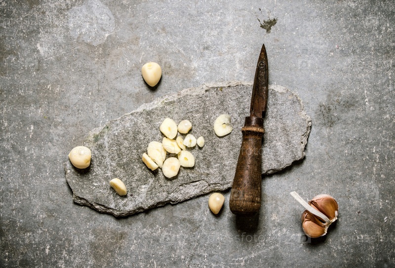 Рубленый чеснок и старый нож на каменном стенде
