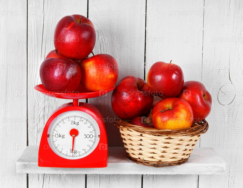 Яблоки на весах и в корзине
