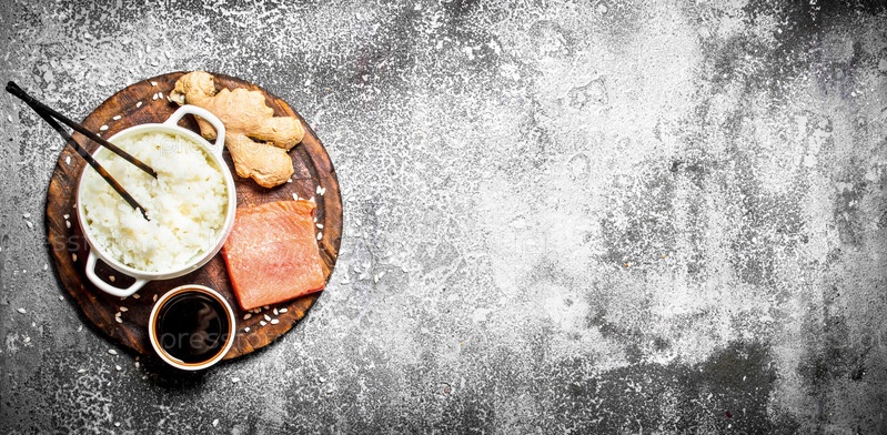 Азиатская еда. Вареный рис с кусочком лосося и соевым соусом