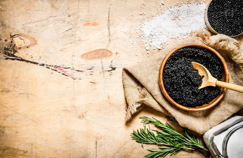 Черная икра в чашке с солью и розмарином