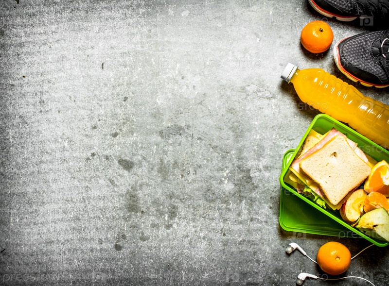 Бутерброды, апельсиновый сок и фрукты