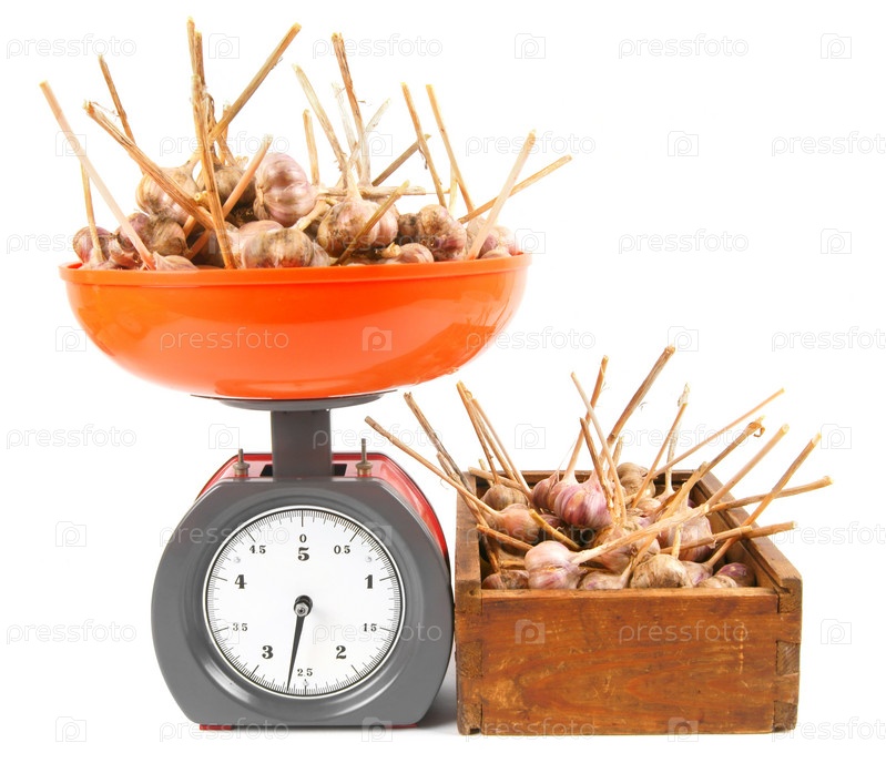 Чеснок на весах и в коробке