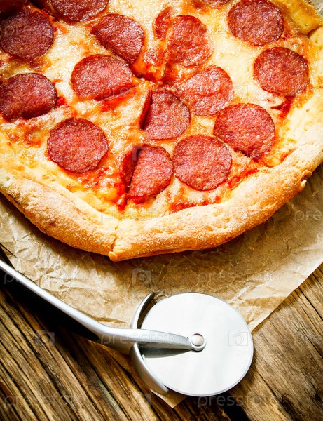 Вкусная пицца и нож на старой бумаге