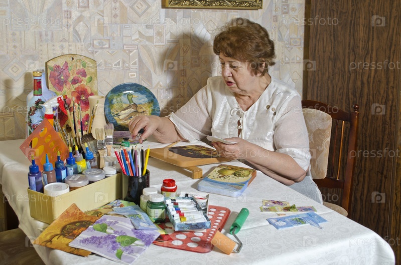Счастливая пожилая женщина-художник делает декупаж