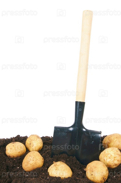 Свежий картофель и лопата на земле