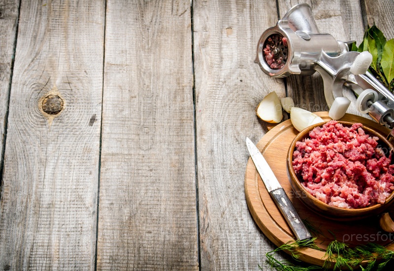 Фон с мясным фаршем в миске, мясорубка и специи