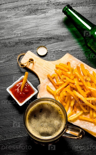 Пиво и картофель фри с томатным соусом на доске