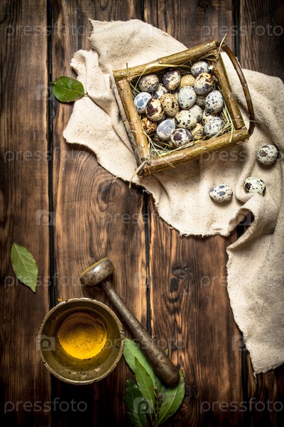 Перепелиные яйца в корзине и специями