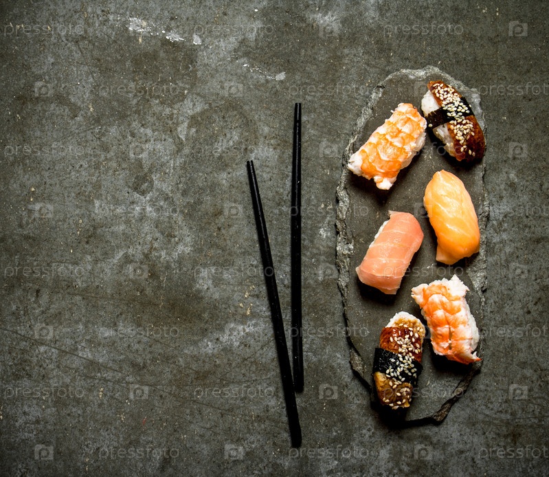 Японские суши с лососем, креветкой и угрем