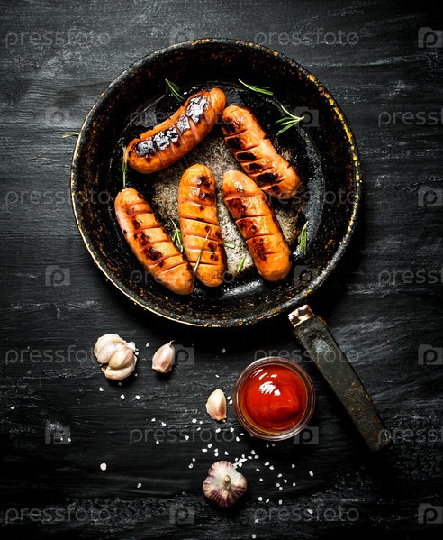 Жареные колбаски с чесноком и томатным соусом на сковороде
