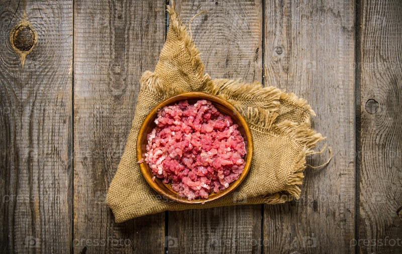 Сырое рубленое мясо в деревянной миске на старой ткани