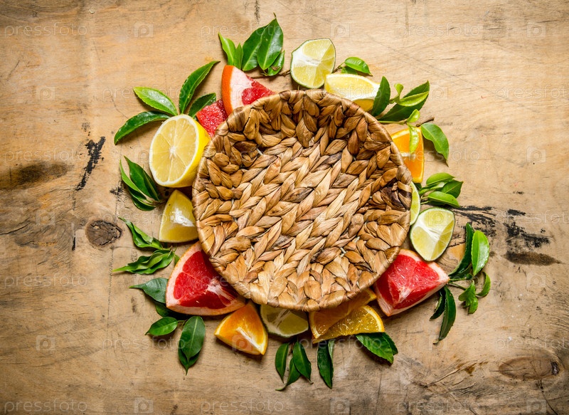 Цитрусовые - грейпфрут, апельсин, мандарин, лимон, лайм с листьями
