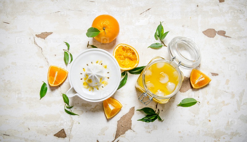 Свежий апельсиновый сок со льдом, с кусочками апельсинов и соковыжималка