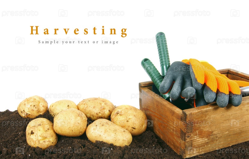 Сбор урожая. Свежий картофель в старой коробке на земле