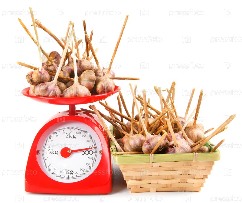 Чеснок на весах и в корзине
