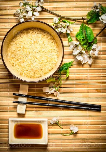 Чаша с рисом, соевый соус и ветви вишни