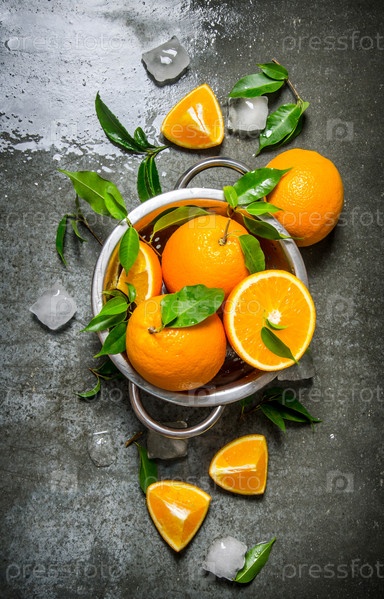 Свежие апельсины в кастрюле с кубиками льда и листьями
