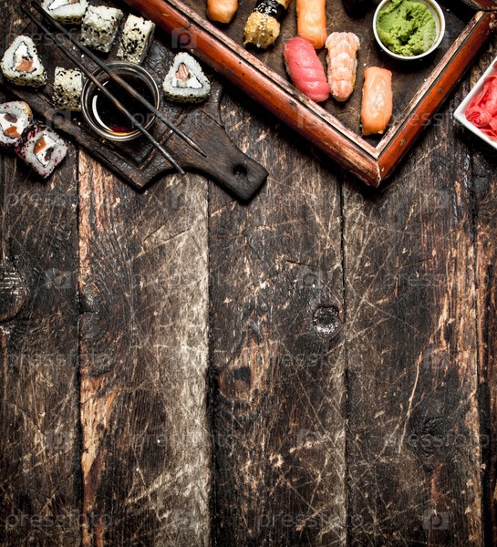 Японская еда. Свежие суши и роллы с соевым соусом