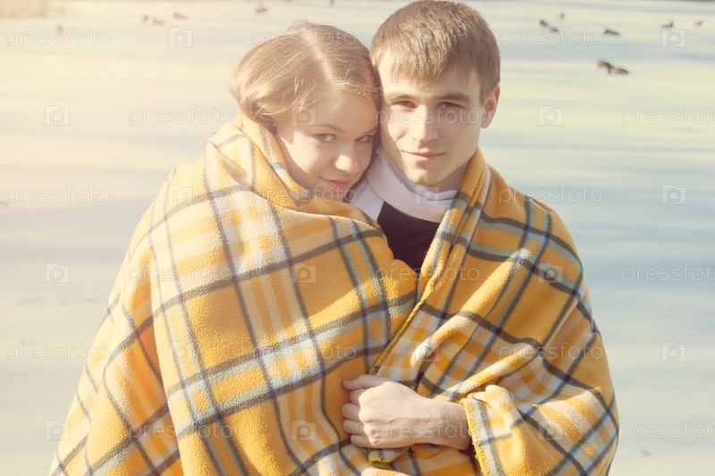 Молодая влюбленная пара в пледе