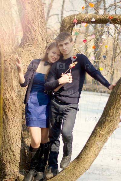 Молодая красивая пара на дереве