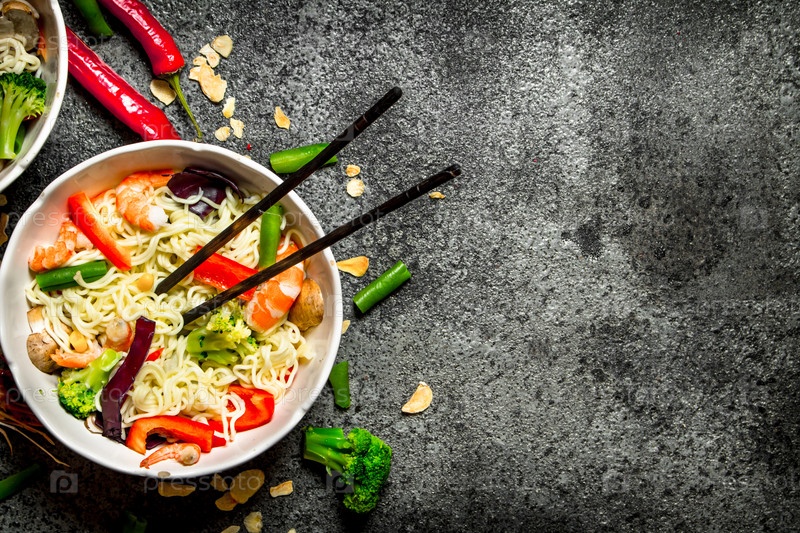 Китайская лапша с овощами и креветками