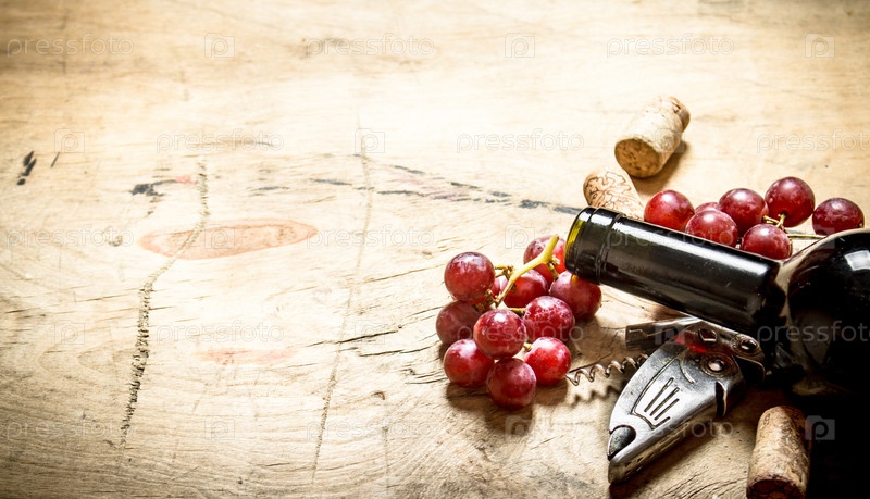 Красное вино со штопором, виноградом и пробкой