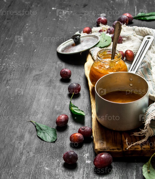 Размятые спелые сливы в маленькой кастрюле