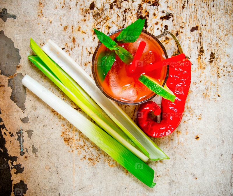 Коктейль из томатов с сельдереем на деревенском фоне
