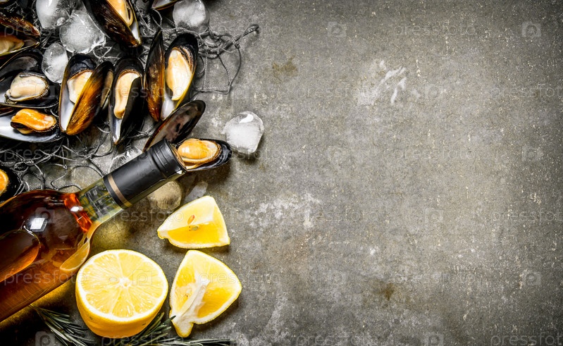 Свежие мидии на рыболовной сети с лимоном и вином