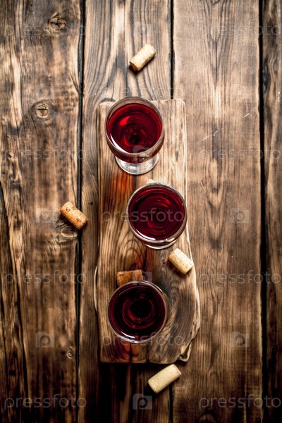 Красное вино на деревянной доске с пробками и штопором