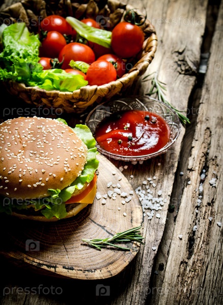 Вкусный гамбургер с соусом на деревянной доске
