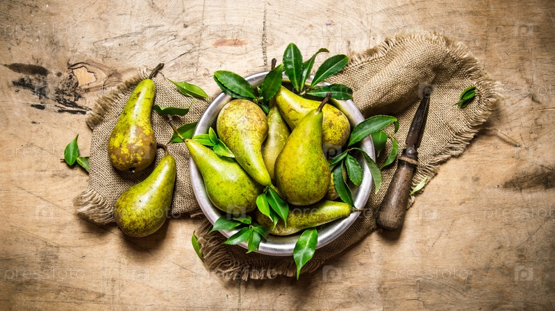 Свежие груши в миске с ножом на старой ткани