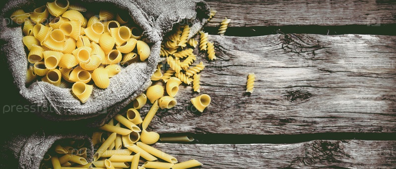 Несколько видов макарон в старых мешках