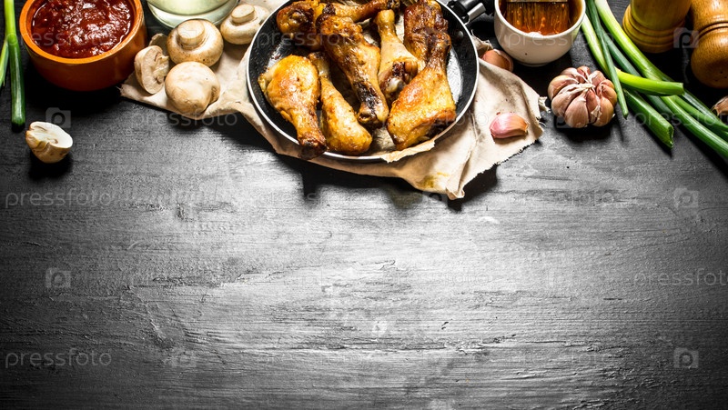 Жареная курица с грибами, чесноком, луком