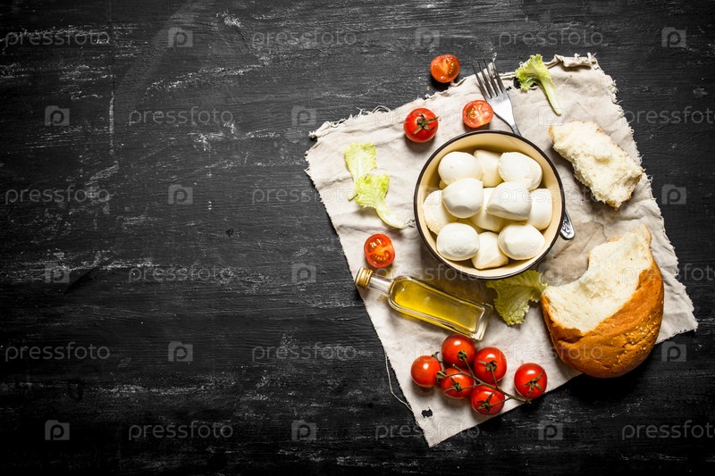 Моцарелла со свежим хлебом, помидорами и зеленью