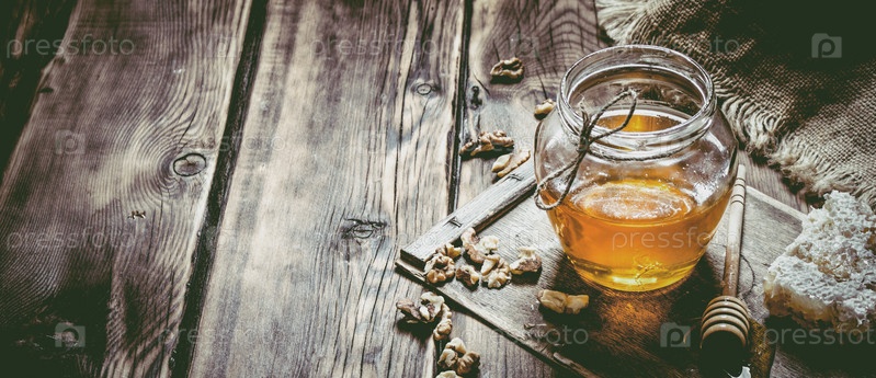 Сладкий мед в сотах, стеклянная банка с орехами