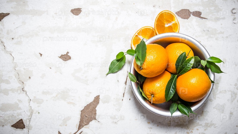 Свежие апельсины с листьями в миске
