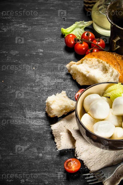 Моцарелла со свежим хлебом, помидорами и зеленью