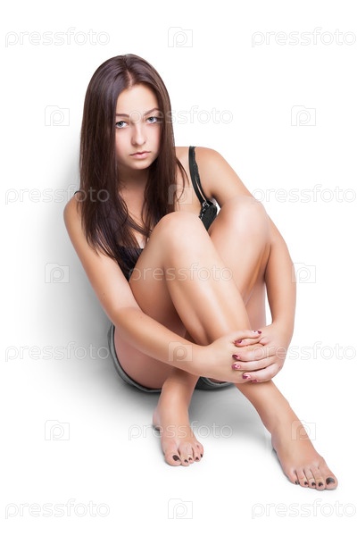 Красивая девушка, сидящая на белом фоне