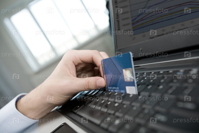 Близкий план человеческой руки на клавиатуре ноутбука с пластиковой картой